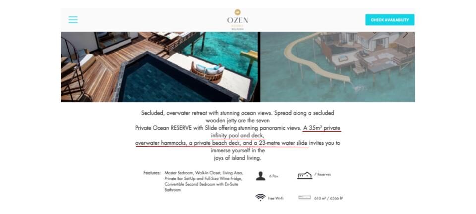 1) The villa, even including outdoor space is not half this size. I actually took the time to measure the outer perimeter of the deck and made some forgiving measurements of the second floor and I don't believe its greater than 3,100 square feet with probably 1,500 of interior square feet. 2) the room is connected by jetty - it is not free standing. We were shocked when we arrived that a golf cart was taking us to out room when we were expecting to have a boat transfer us to the room, and 3) of course as mentioned there is not boat to take you to the room. Over the course of our stay we repeatedly asked for the room measurements and they were never provided. However, after requesting through our travel agent (a whole other story) a partial refund, the hotel changed their website to reflect a 4,521 sqft room. I look now as of writing and its back to 6,566 square feet. We booked the room based on size, exclusivity and the uniqueness of having private boat access and received none of them - and as of yet we do not have a refund. Also, nowhere are you warned when booking that most of the resort views the non-stop-smoldering Male landfill ( research Thilafushi ). It's an environmental nightmare. We had multiple issues and because of the dishonesty I simply cannot recommend Ozen Reserve Bolifushi. My travel agent should have screened this properly but, unfortunately they didn't and that's another story. I will say one good thing, the water sports staff were great as were most of the restaurant staff. Lastly, and this is just informational, it felt to my wife and me that the resort caters mostly to Russian guests.